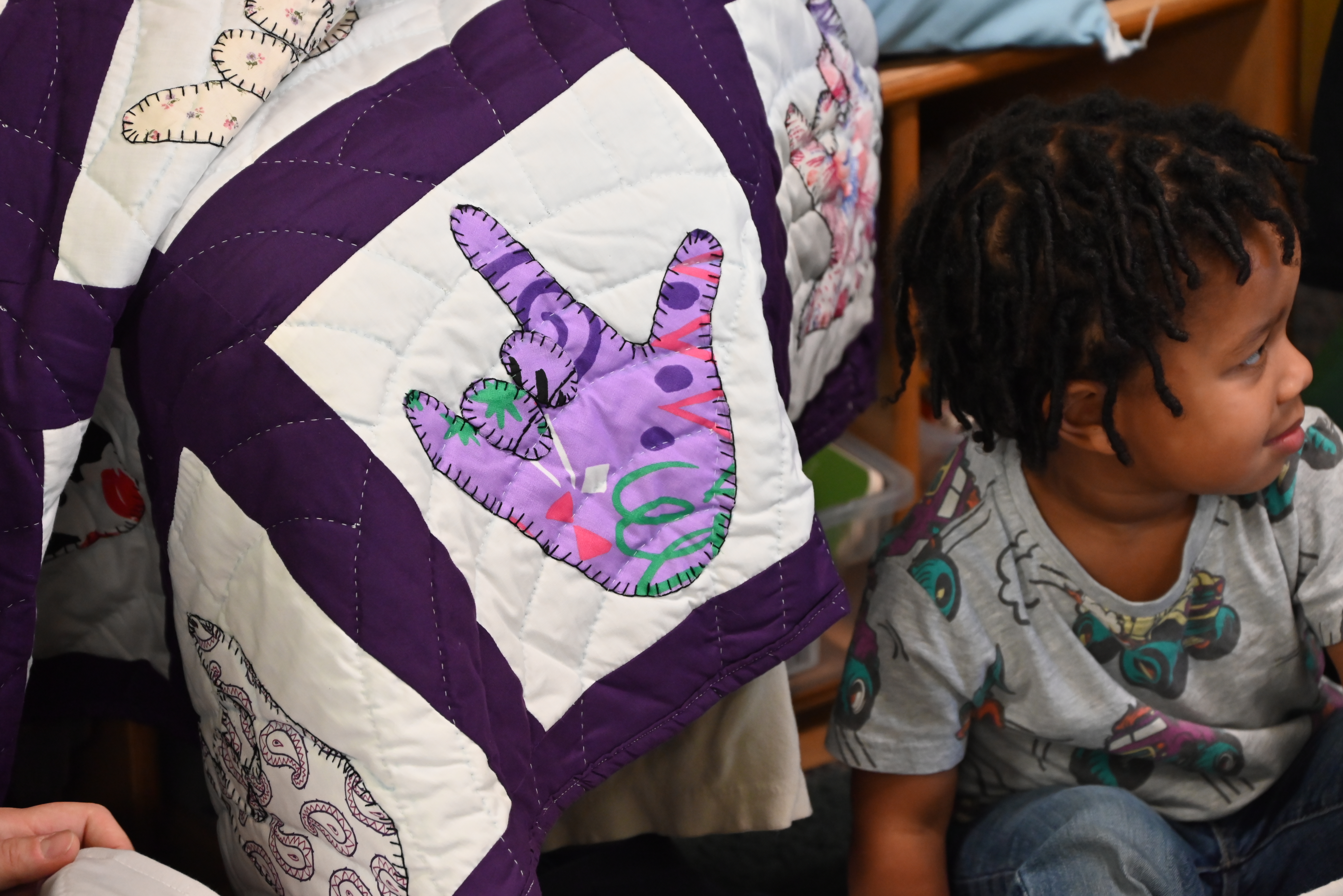 Rose’s mother sewed many variations of American Sign Language “I Love You” hands. After her passing, Rose was inspired to repurpose the hands by sewing them onto 16 quilts which she donated to the Kelly's Kids Child Development Center, located on the campus of SCSDB in Spartanburg.